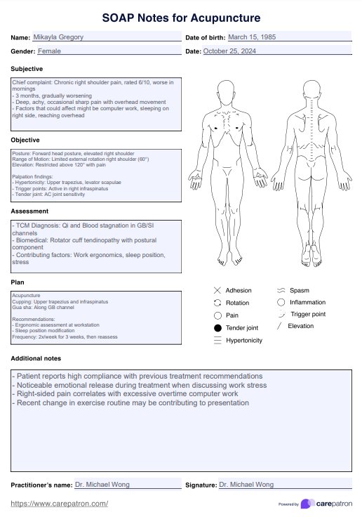 Documenting acupuncture involves detailing the treatment protocol in the objective section of the SOAP note, including specific acupuncture points used, techniques applied (e.g., needling, moxibustion), duration of treatment, and any immediate reactions observed. It’s also important to record the patient's response to treatment in subsequent visits.