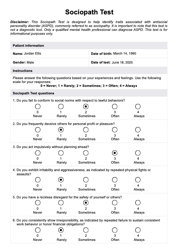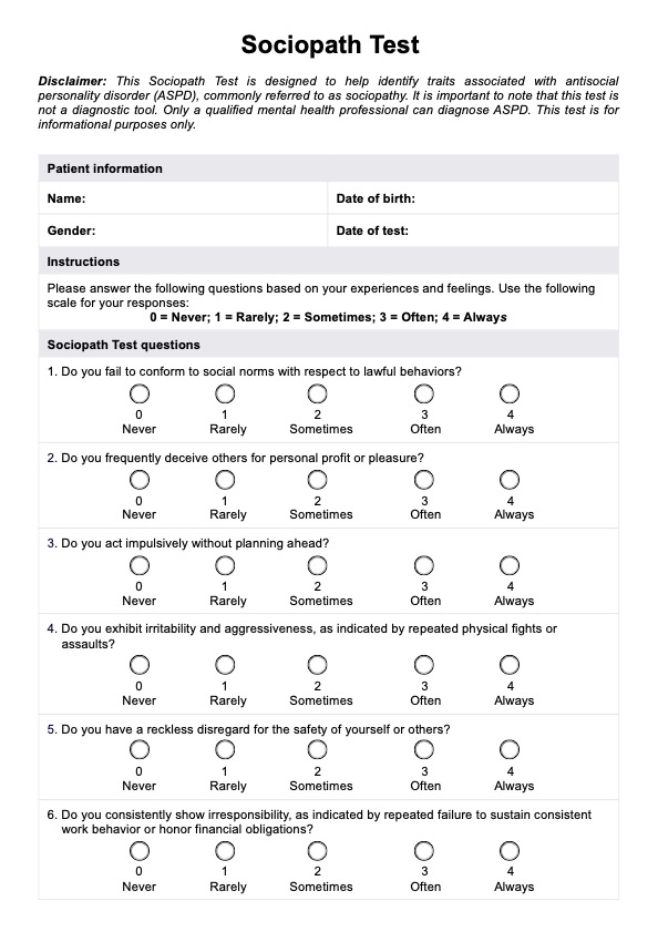 Explore clients' behavioral patterns with our free Sociopath Test template. Gain insights and start your journey towards self-understanding today.