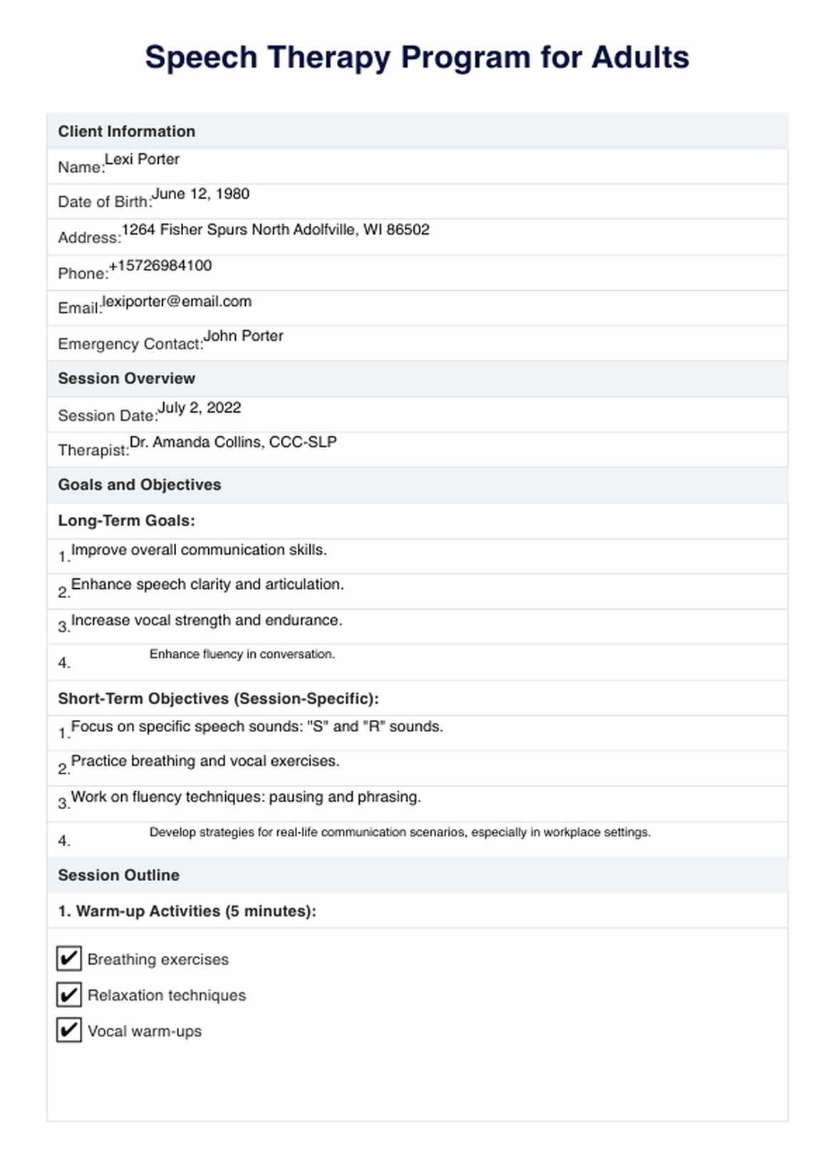 In speech therapy for adults, various techniques are employed to address communication challenges. These may include articulation exercises, language drills, and cognitive activities tailored to individual needs. Carepatron's speech therapy for adults PDF templates offers a structured approach, providing exercises and guides to effectively enhance speech and language skills.