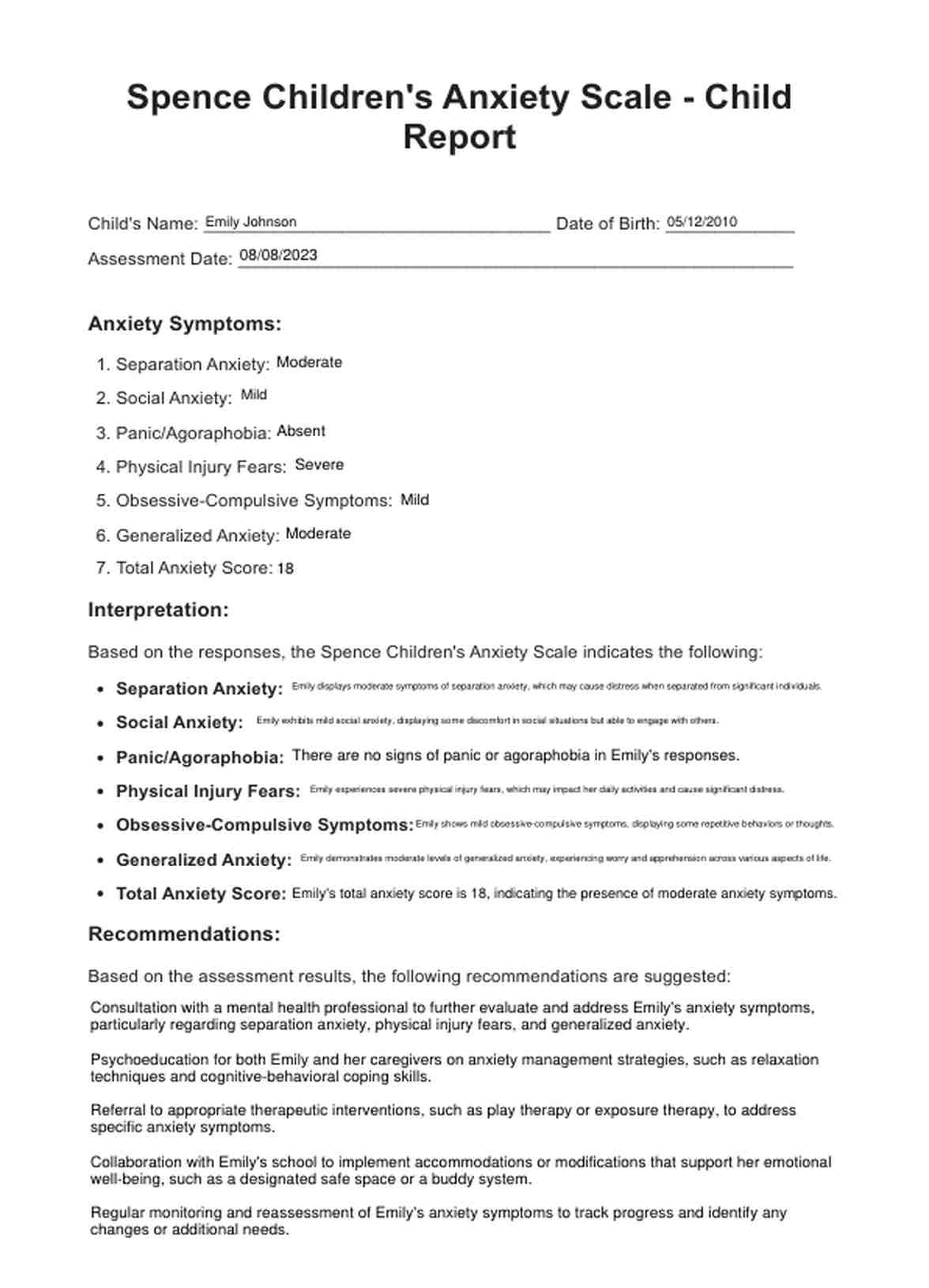 Begin by getting the raw scores of each subscale by summing up the ratings the child gave. Second, convert these to percentile ranks or the established norms for the child’s age and gender. Higher percentile ranks indicate higher anxiety level symptoms. Third, you need to consider clinical cutoffs to determine whether the score lands at a normal range or indicates a need for an intervention. Fourth, analyze subscale scores to determine the most prominent area of anxiety symptoms. Lastly, you may incorporate other relevant information in the child’s life, including their history and behavior.