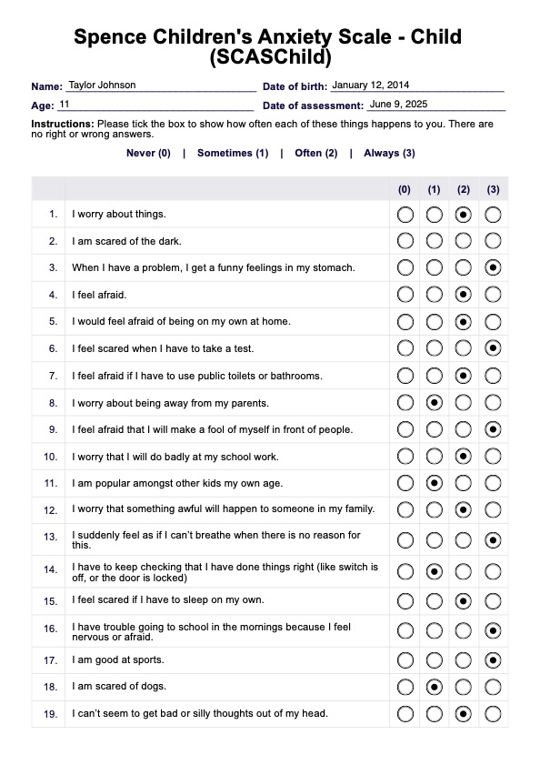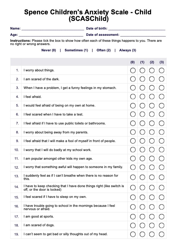 The Spence Children’s Anxiety Scale - Child Report is not a diagnostic tool. It is a test used for screening and assessment of anxiety symptoms. Although it is not a diagnostic tool, it can aid in forming a diagnosis because it offers relevant information about the nature and severity of the anxiety symptoms. The information provided by SCAS is vital in making a diagnosis.