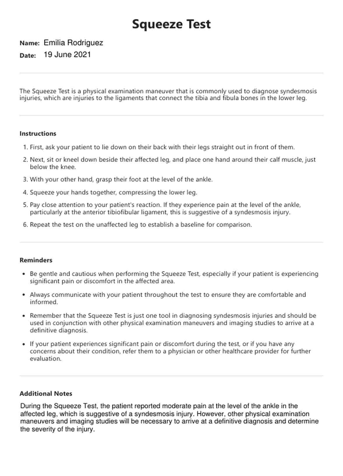 Learn about the Squeeze Test and how it can help diagnose syndesmosis injuries. Get access to a free PDF template and example.