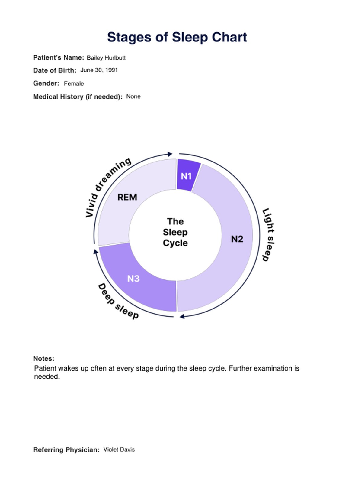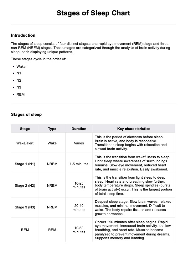 Access Carepatron's free Stages of Sleep Chart PDF chart and enhance clinical understanding of sleep cycles with detailed examples for patient assessments.