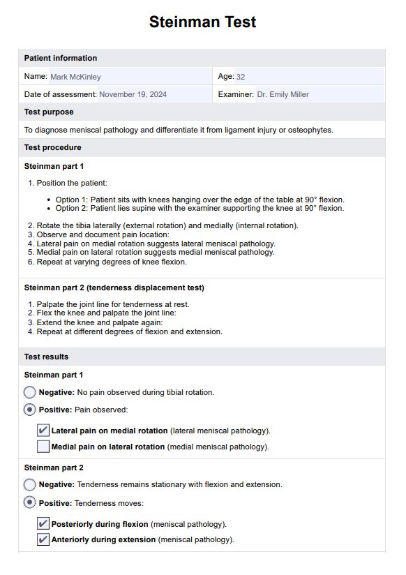 Learn all about the Steinman Test and its use in diagnosing meniscal injuries. Use our template to conduct the test accurately and effectively.