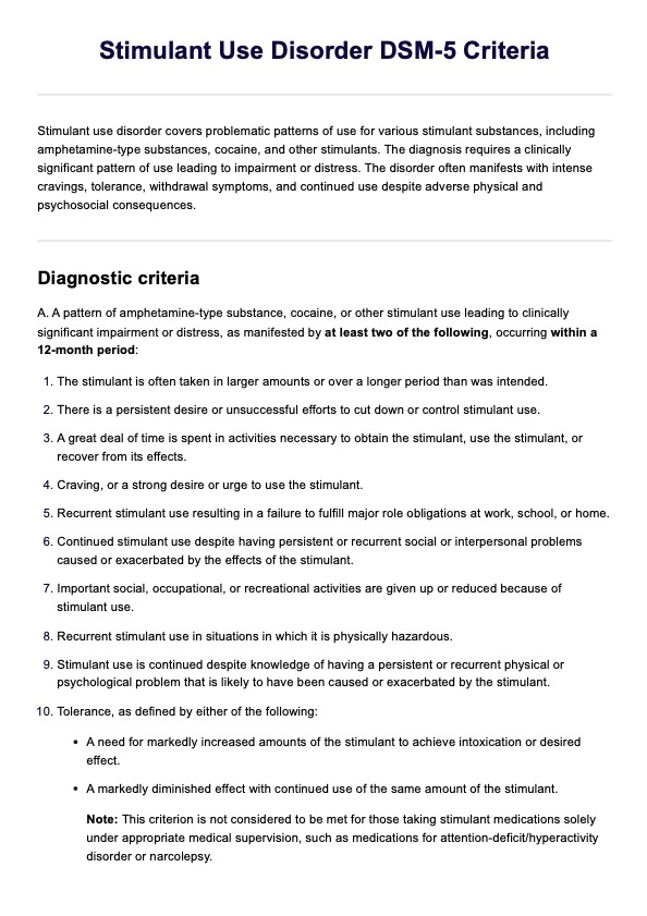 Download a reference handout tool with our Stimulant Use Disorder DSM-5 Criteria template to use in your clinical practice.