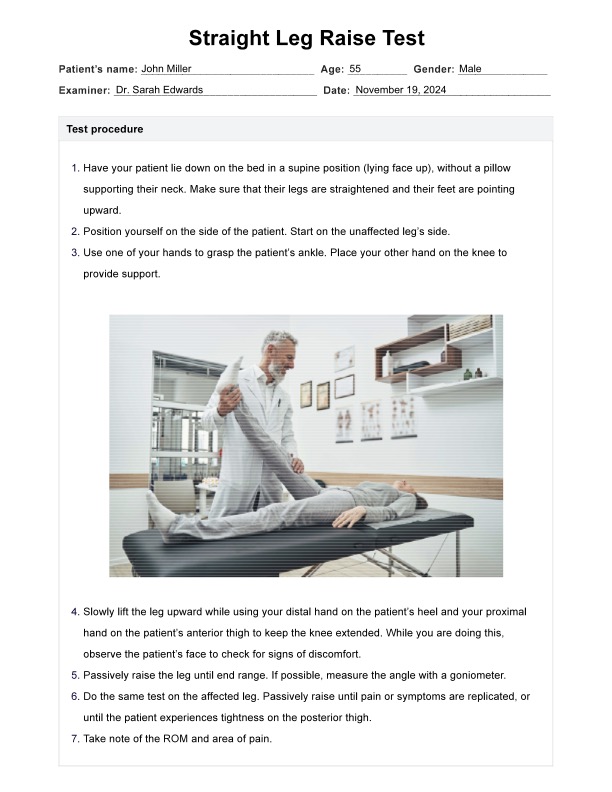 The Straight Leg Raise Test can help you check for nerve irritation signs and disc pathologies. Use our template for improved accuracy and consistency.