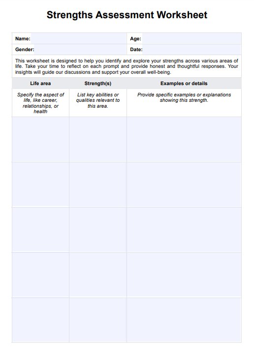 Mental health professionals can use a Strengths Worksheet during one-on-one sessions with clients. It also makes an excellent follow-up tool, particularly when paired with other assessments.