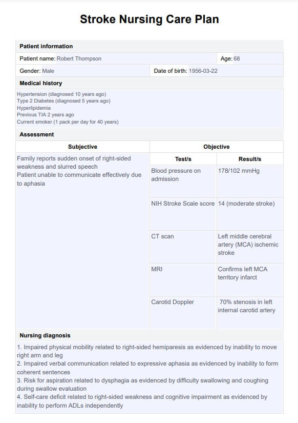 To create a comprehensive nursing care plan for stroke management, simply create a customized plan from the template provided by Carepatron and cater to the patient's needs through the key aspects of assessment, diagnosis, planning, intervention, and evaluation.