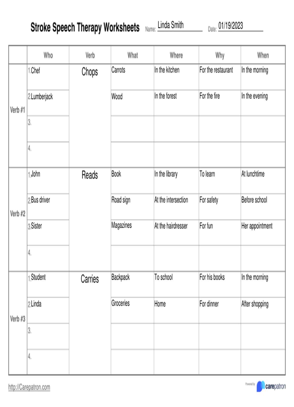 This Stroke Speech Therapy Worksheet is designed to be completed by speech-language therapists and their clients struggling with aphasia post-stroke. This should be a collaborative effort, particularly at first, with the SLT assisting their client to different levels depending on their needs.