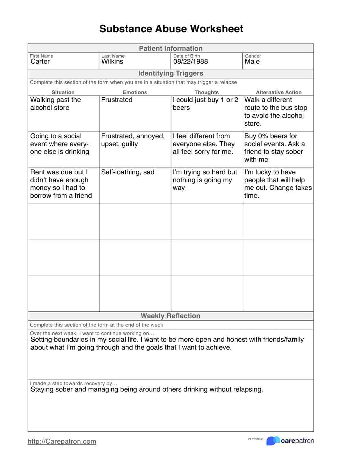 This worksheet has been designed to be used by any patient that is experiencing substance abuse issues. Regardless of how significant the patient’s condition is, or how long they have been seeking treatment, this worksheet will have vast benefits – for both you and them.