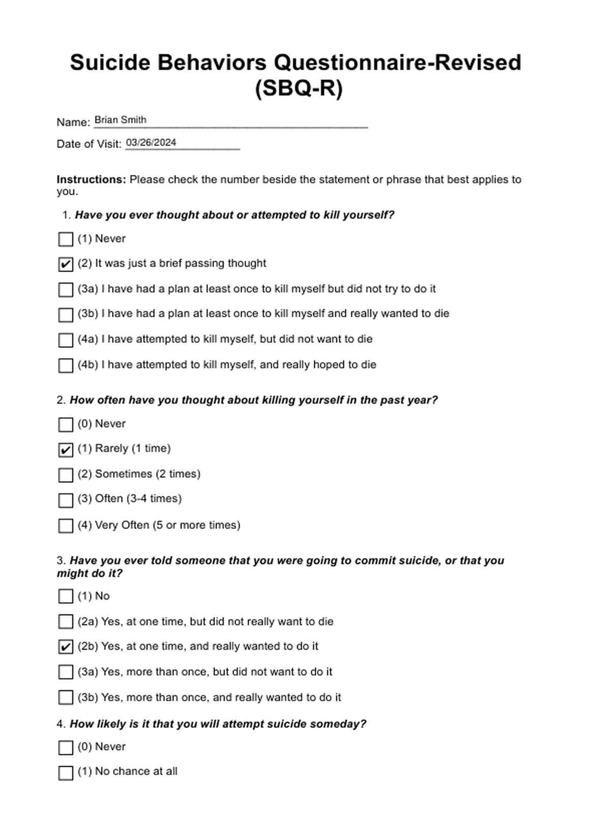 The Suicide Behaviors Questionnaire (SBQ) and Suicide Behaviors Questionnaire-Revised (SBQ-R) are self-report screening tools utilized in various settings to assess suicide risk. These brief questionnaires take about 5 minutes to complete and cover important areas such as lifetime ideation/attempts, recent ideation frequency, suicide threats, and self-assessed likelihood of future suicidal behavior.