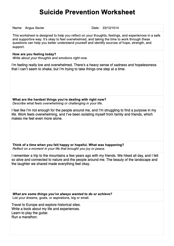 Download a free Suicide Prevention Worksheet template from Carepatron. Use this resource to help your clients during therapy sessions.