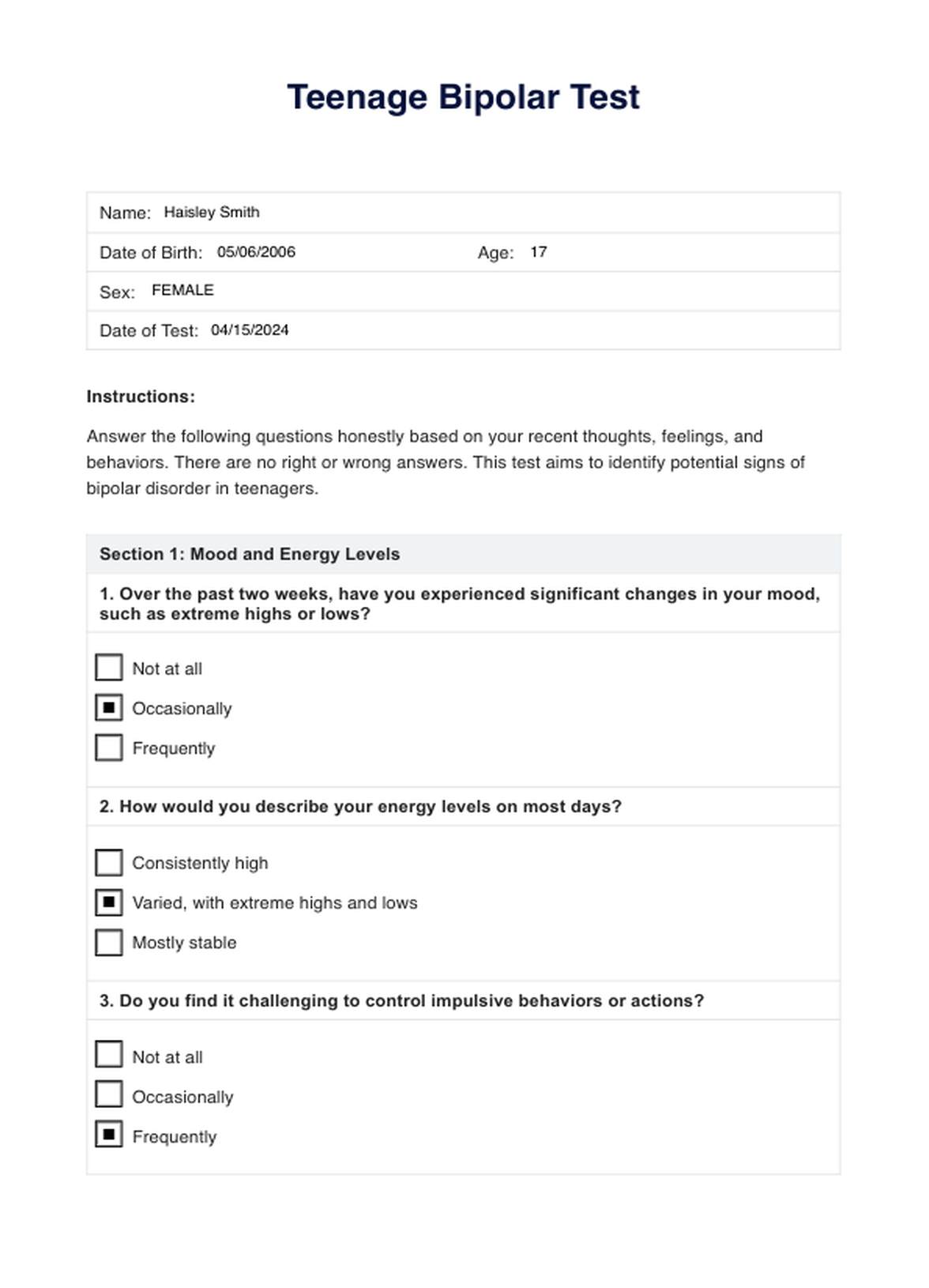 The teenage bipolar test is a crucial tool for identifying potential mood disorder symptoms in adolescents. Download Carepatron's free PDF example to learn how to administer and interpret the test.