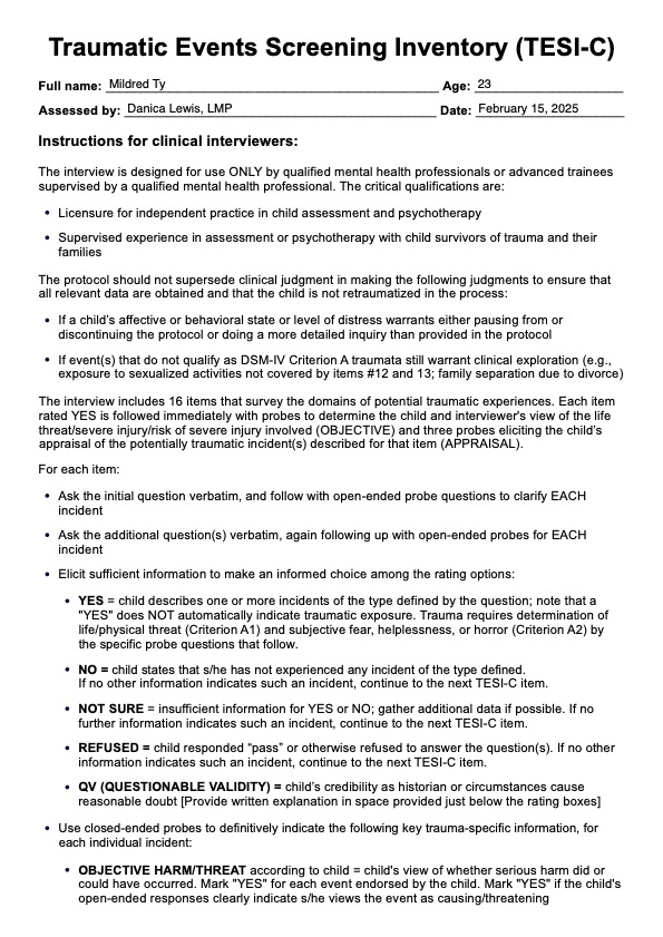 The TESI-C is one of the most effective and validated screening tools for assessing a child's exposure to potentially traumatic events. The interview protocol is made up of 16 items, each of which pertains to a specific trauma category.