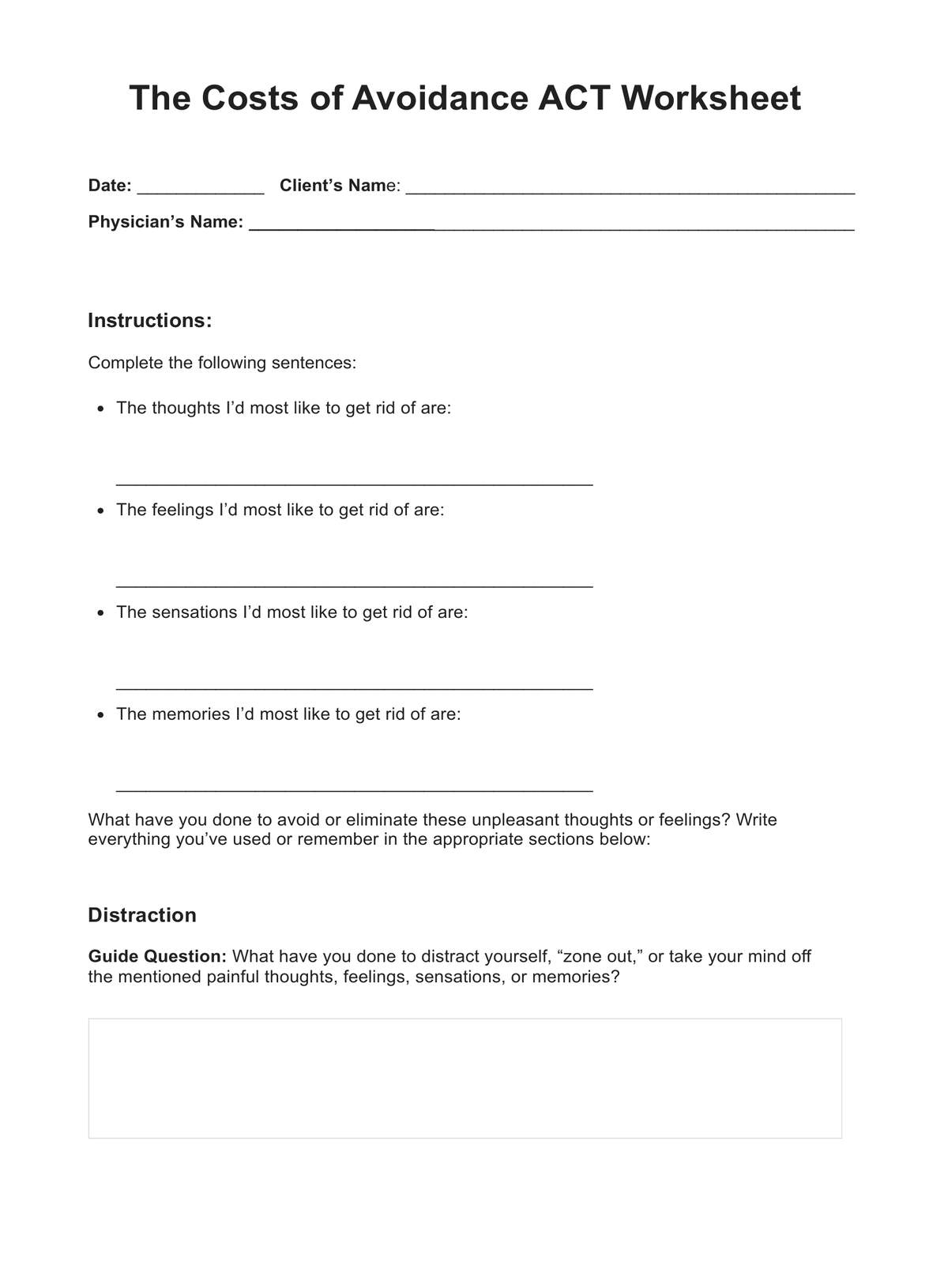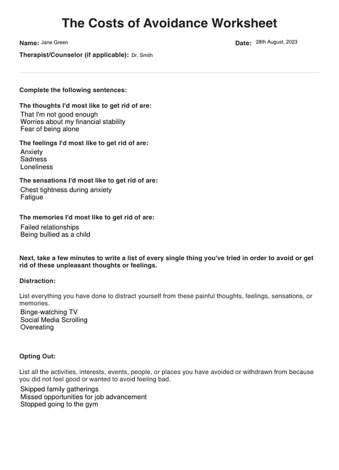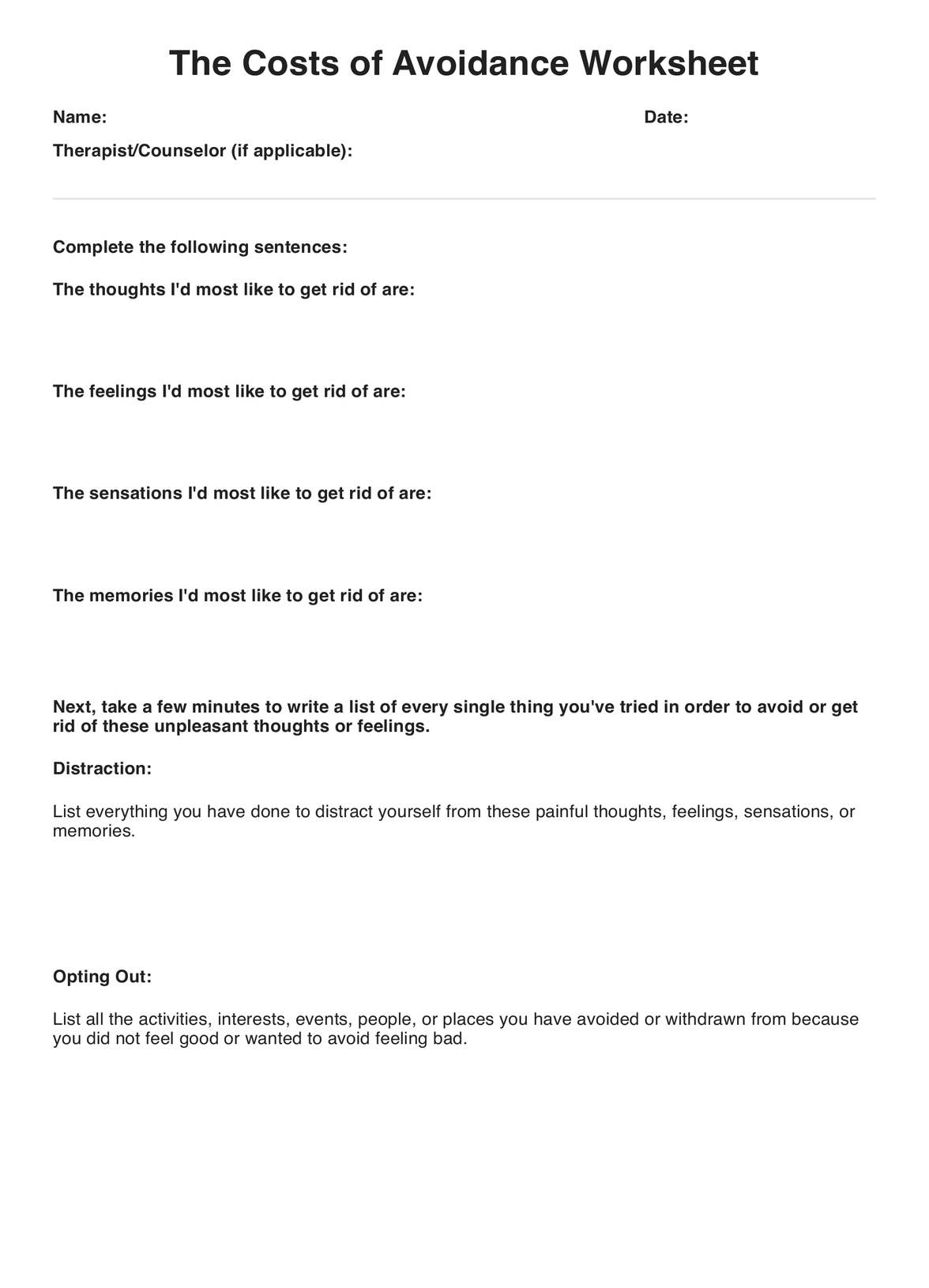 The Costs of Avoidance Worksheet ACT Worksheet