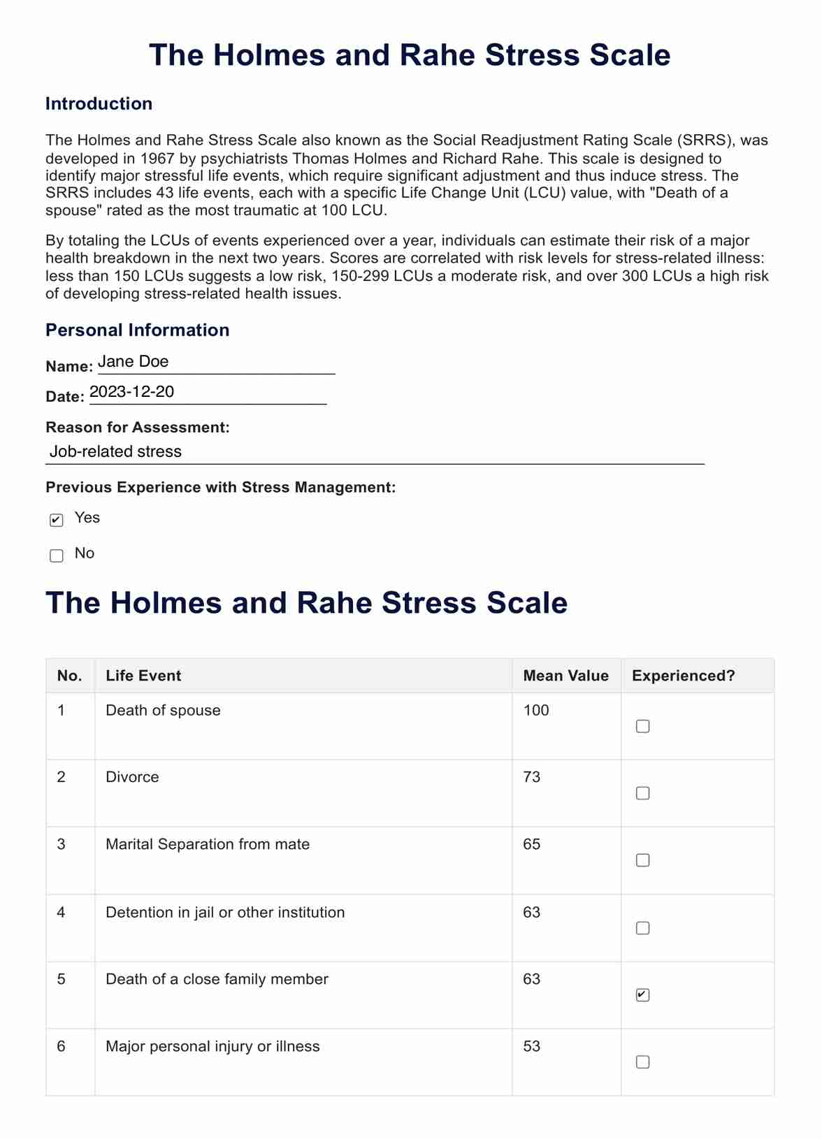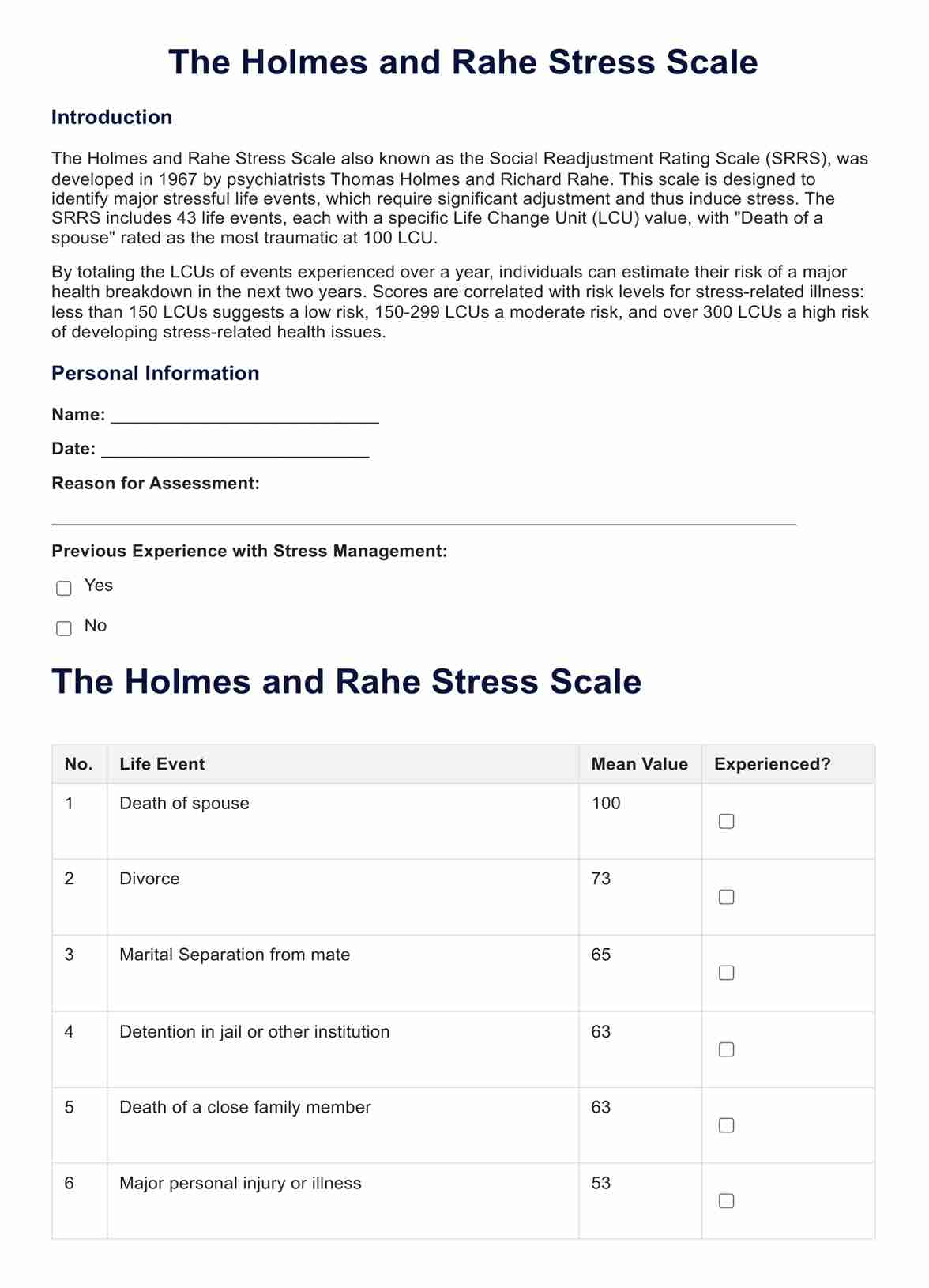 The Holmes and Rahe Stress Scale Template