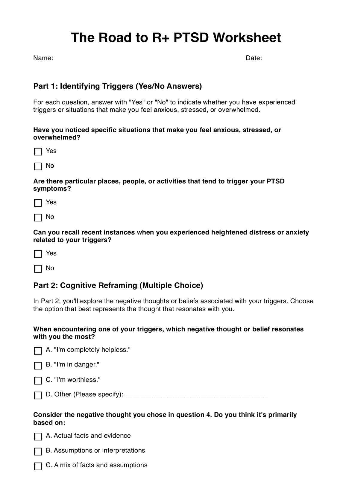 The Road to R+ PTSD Worksheet is a powerful tool for managing PTSD through cognitive behavioral therapy. Download the free PDF and learn how to use it.