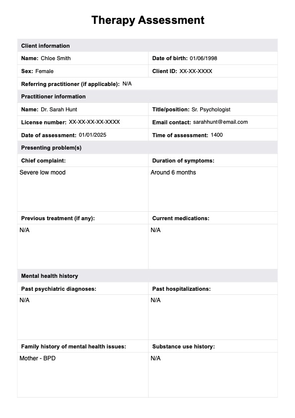Explore our Therapy Assessment template to streamline client evaluations, ensuring comprehensive, effective mental health care.