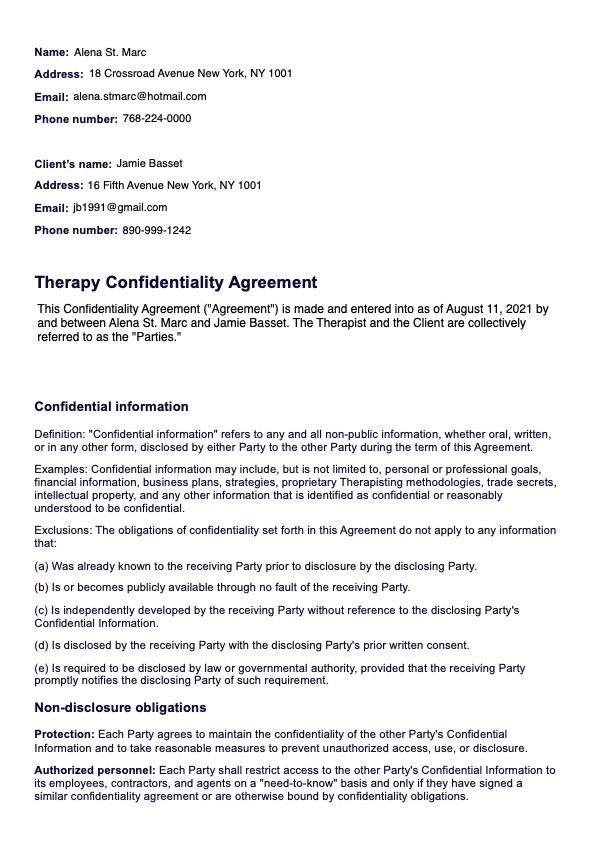 The Therapy Confidentiality Agreement establishes expectations for both parties and addresses payment terms, the scope of therapy services, and other details related to maintaining confidentiality.