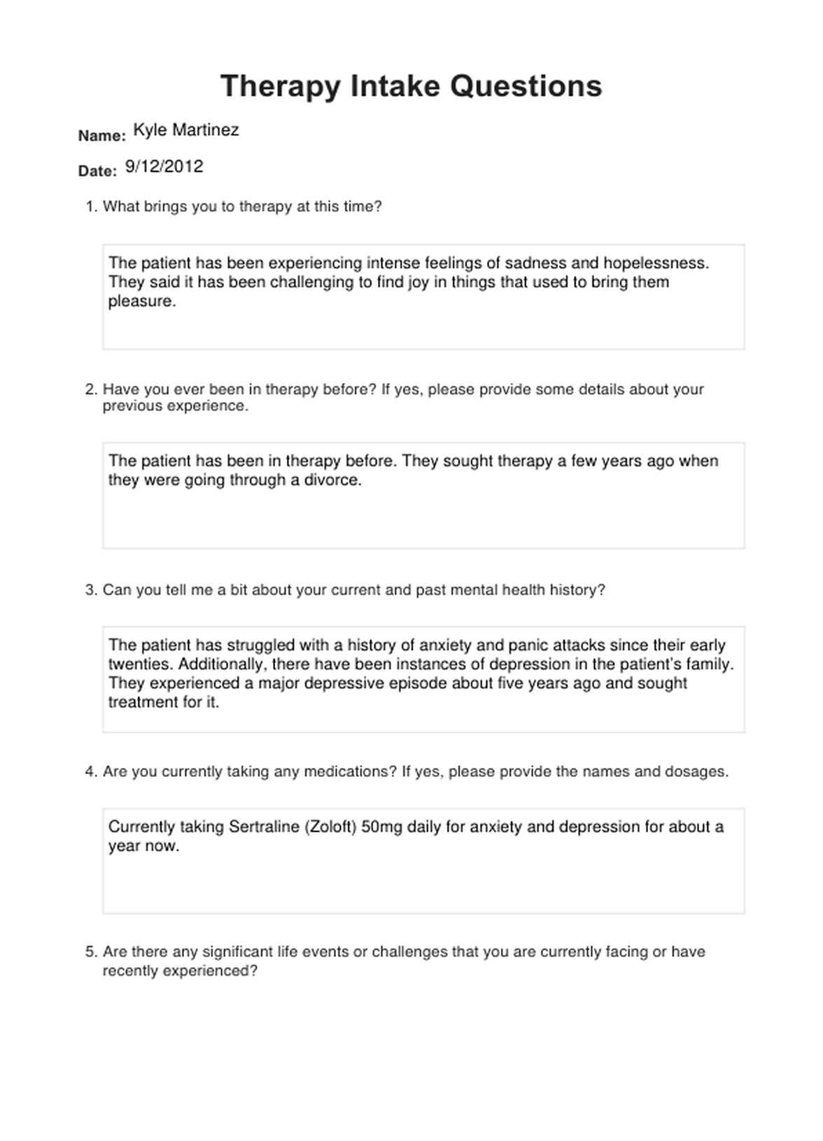 Discover various Therapy Intake Questions you can use to learn more about your clients. Download a free PDF template and example to get started.