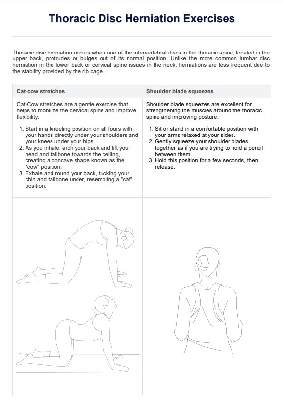 Learn Thoracic Disc Herniation Exercises with Carepatron's free PDF. This handout has examples of exercises to help alleviate symptoms and improve mobility.
