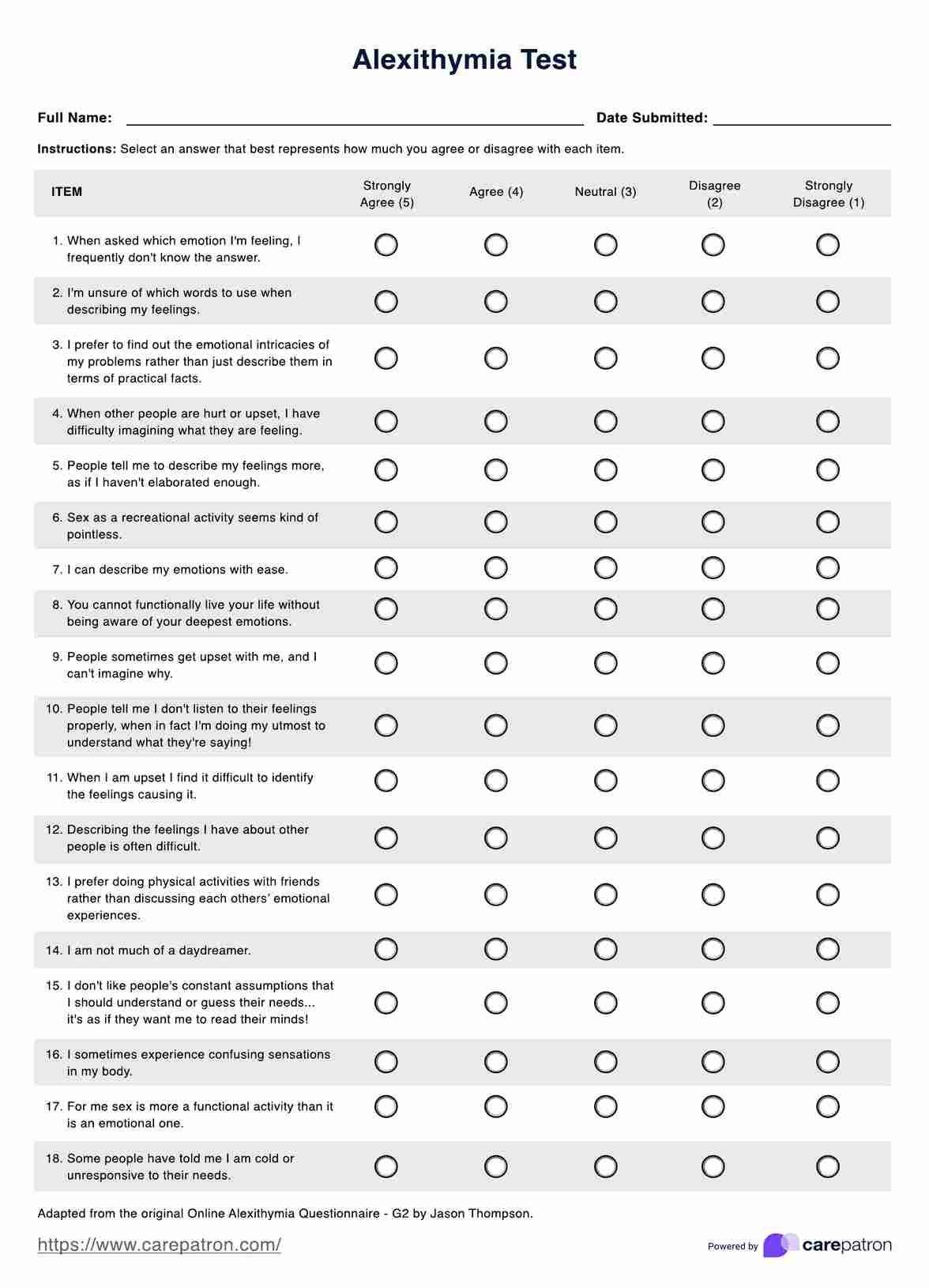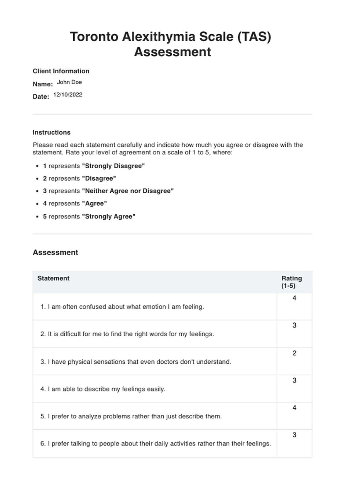 The Toronto Alexithymia Scale (TAS) is a self-report questionnaire with 20 items rated on a 5-point Likert scale. It assesses difficulty identifying feelings, describing feelings to others, and externally oriented thinking. Higher scores indicate a greater degree of alexithymia. Clinicians and researchers use it to understand emotional awareness and processing.