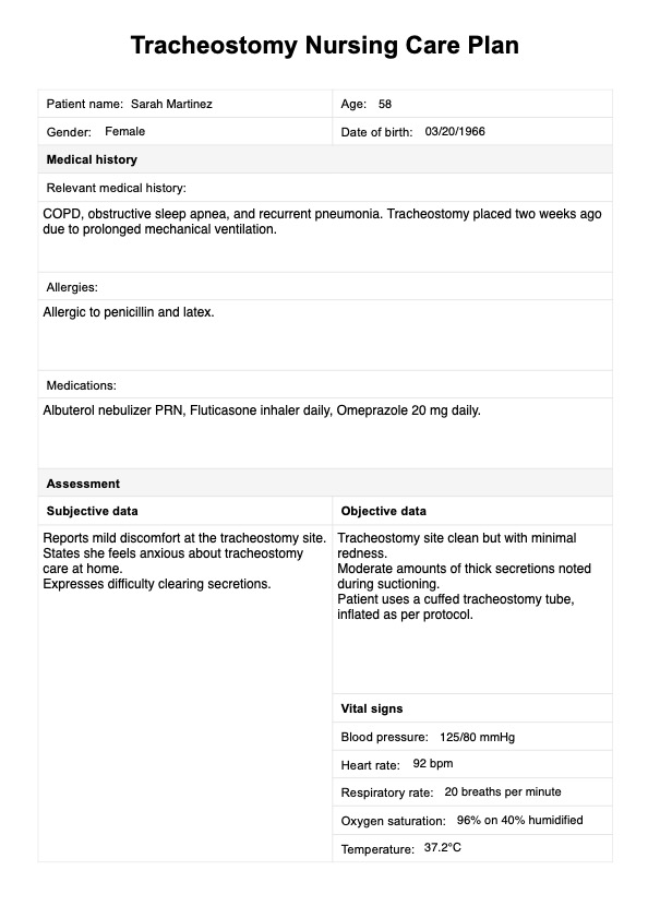 Learn about creating a comprehensive Tracheostomy Nursing Care Plan through Carepatron's free downloadable PDF guide and detailed example.