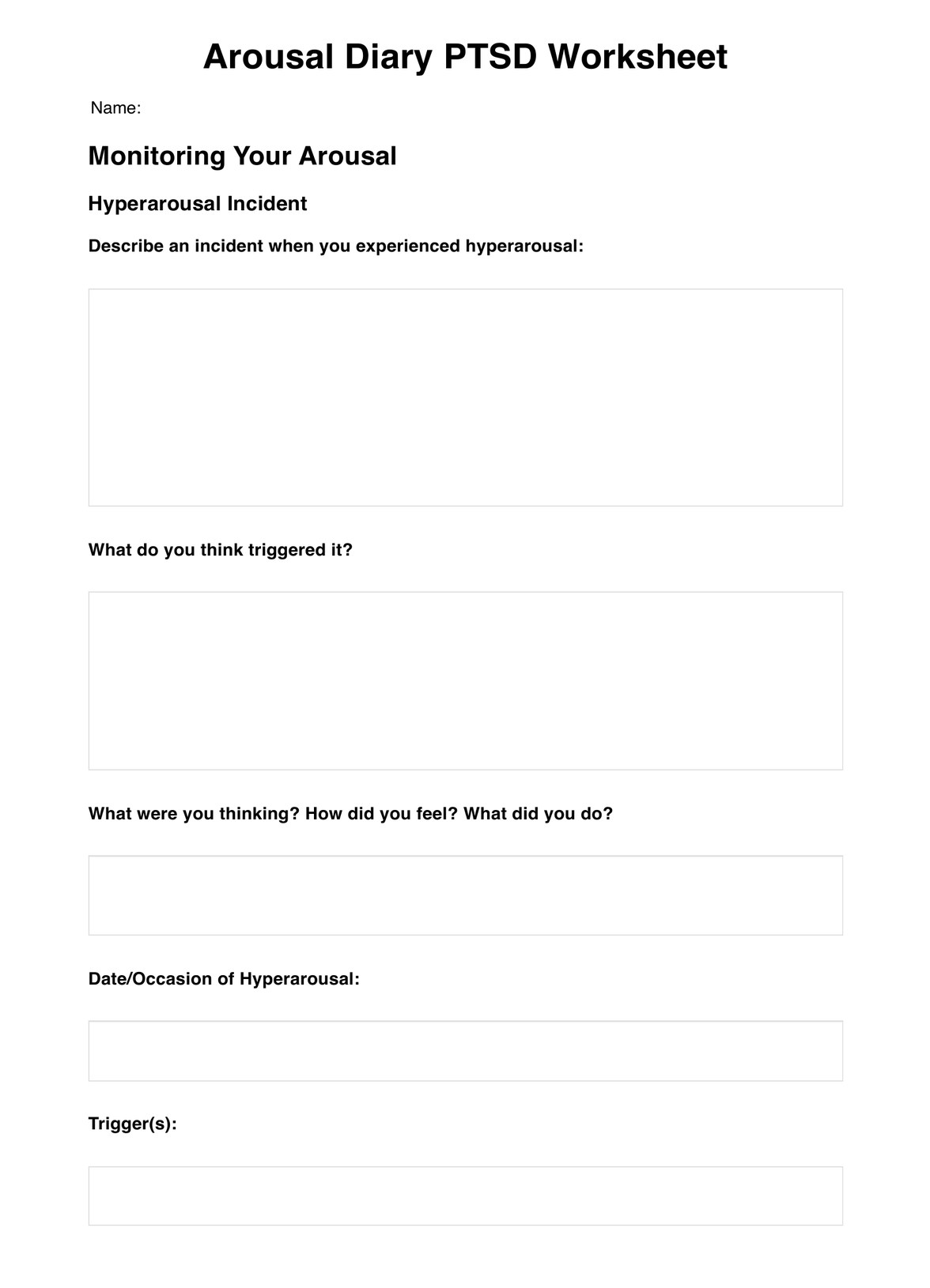 Trauma Arousal PTSD Worksheet Template