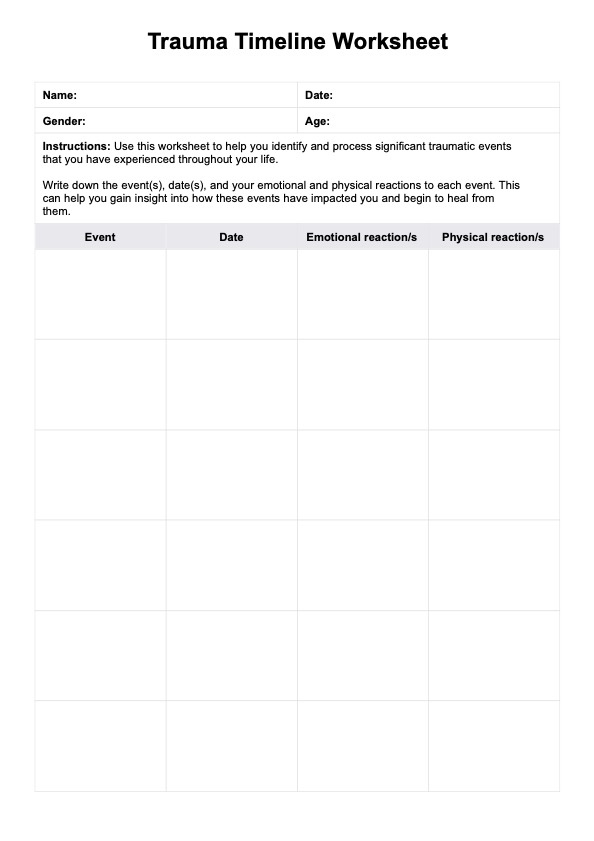 Use this free, downloadable Trauma Timeline Worksheet to better track and understand your patient's trauma timeline from the beginning to the present time.