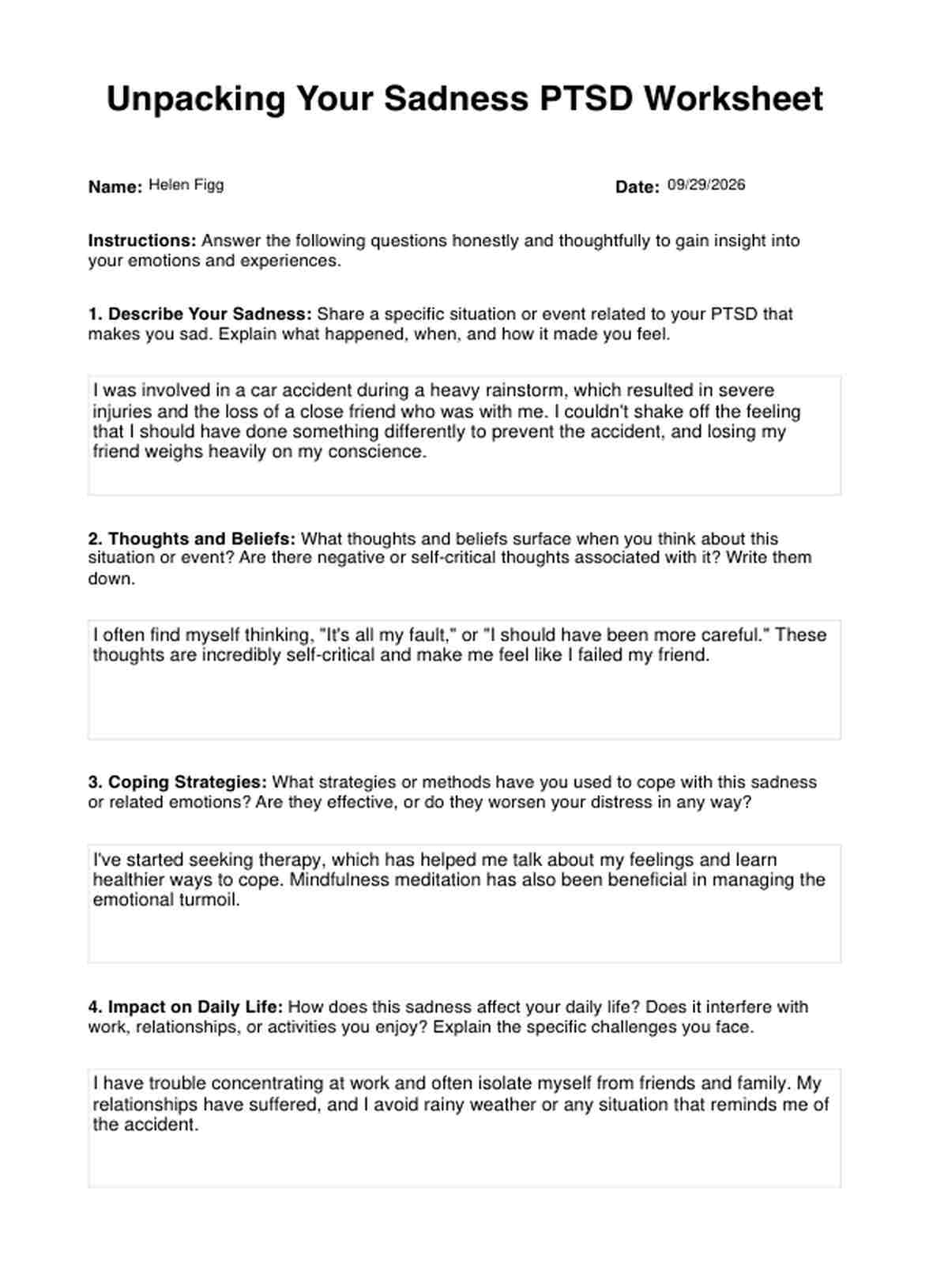 Unpacking Your Sadness PTSD Worksheet