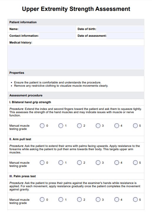 Effectively assess upper extremity strength to gauge physical abilities and use Carepatron's free Upper Extremity Strength Assessment template.