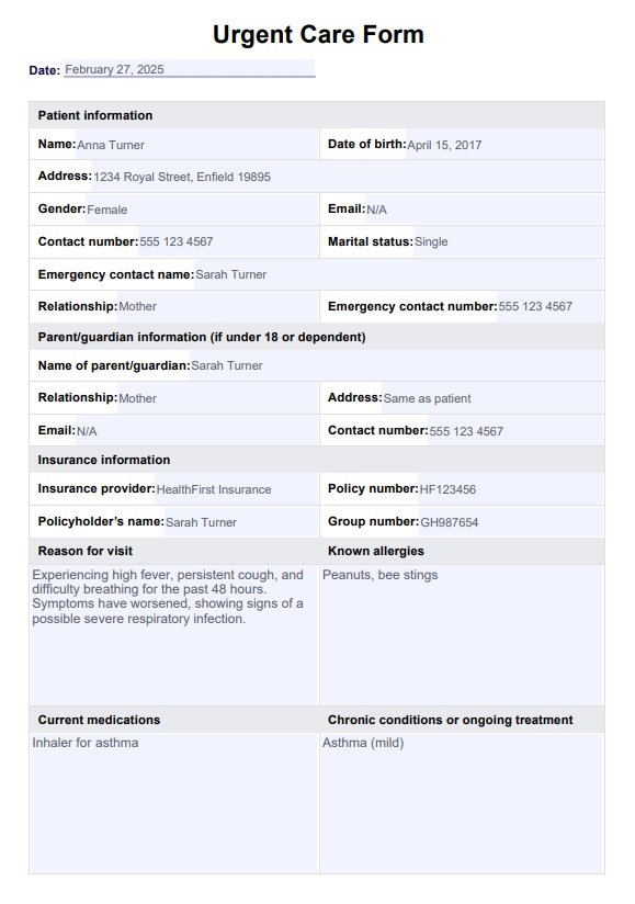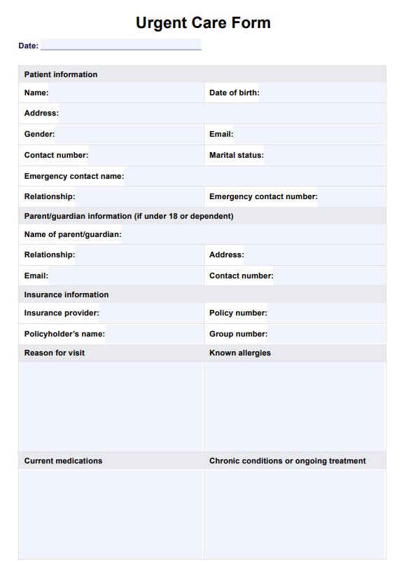 Streamline patient check-in and expedite care with our Urgent Care Form template, designed to efficiently gather vital patient information.