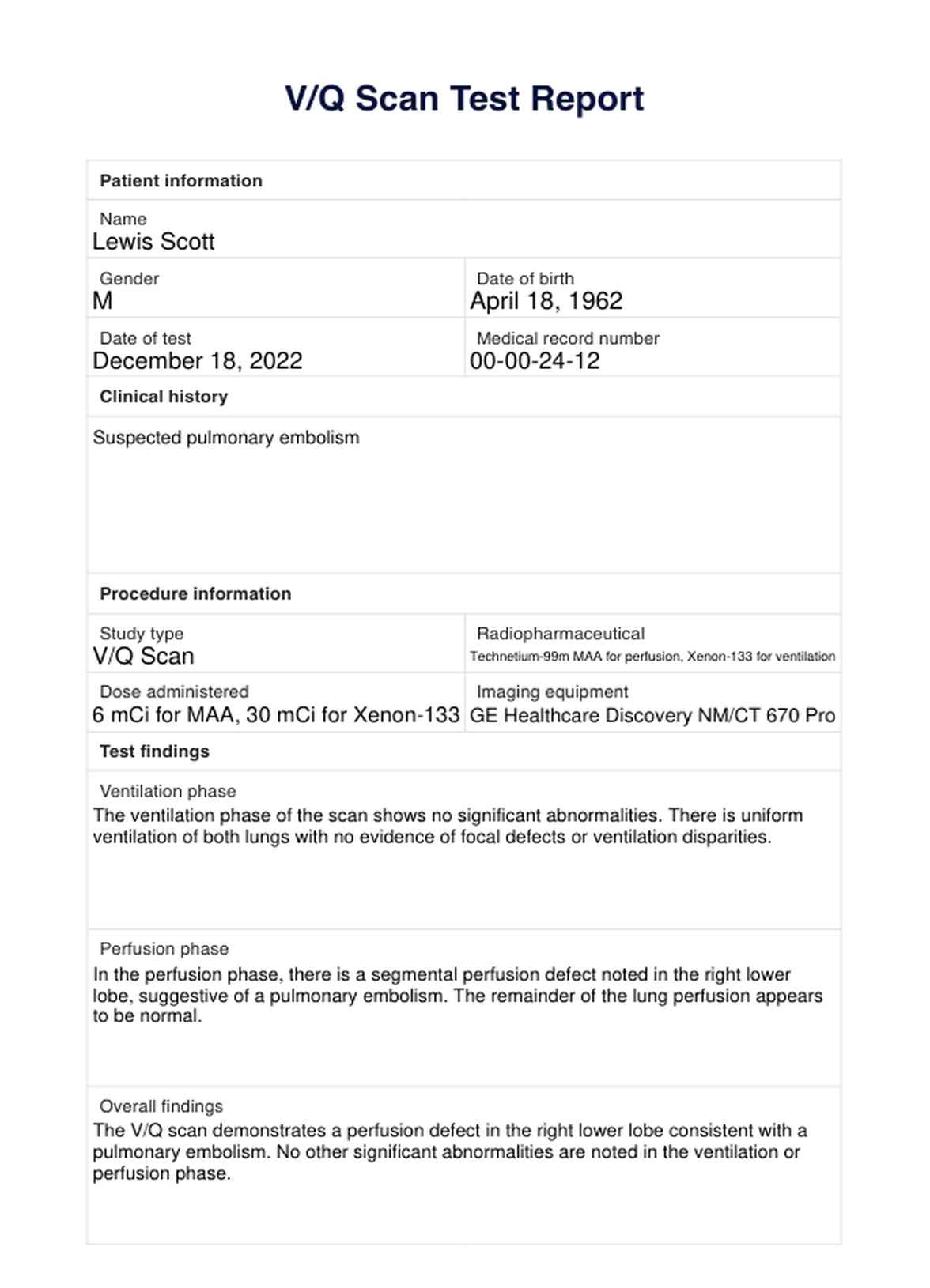 Download a free V/Q Scan Test Report template for easy record-keeping. Get an example of a V/Q scan test report to understand the results and procedure.