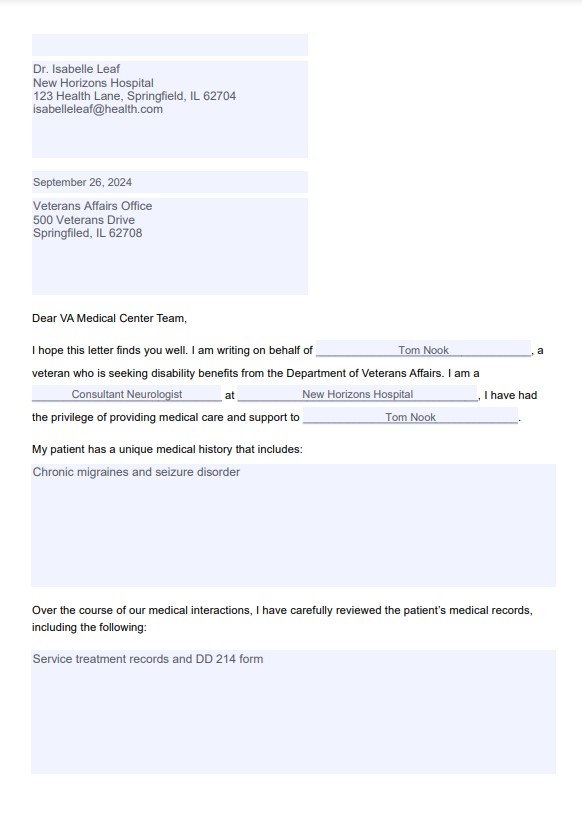 Effortlessly create VA Doctor’s Notes using our template. Support veterans' disability claims with professional medical nexus letters. Get started now!
