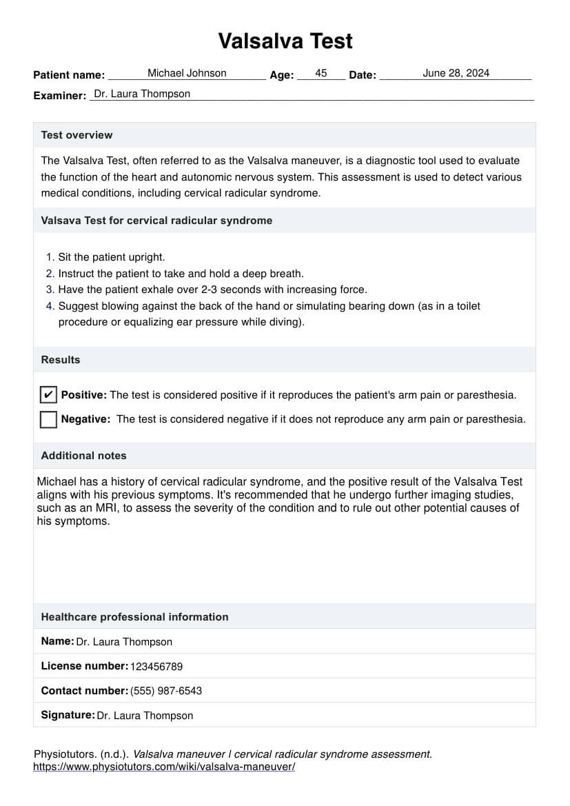 Comprehensive guide on the Valsalva Test: understand cervical radicular syndrome, conduct the test, interpret results, and download our free template for accurate data collection.