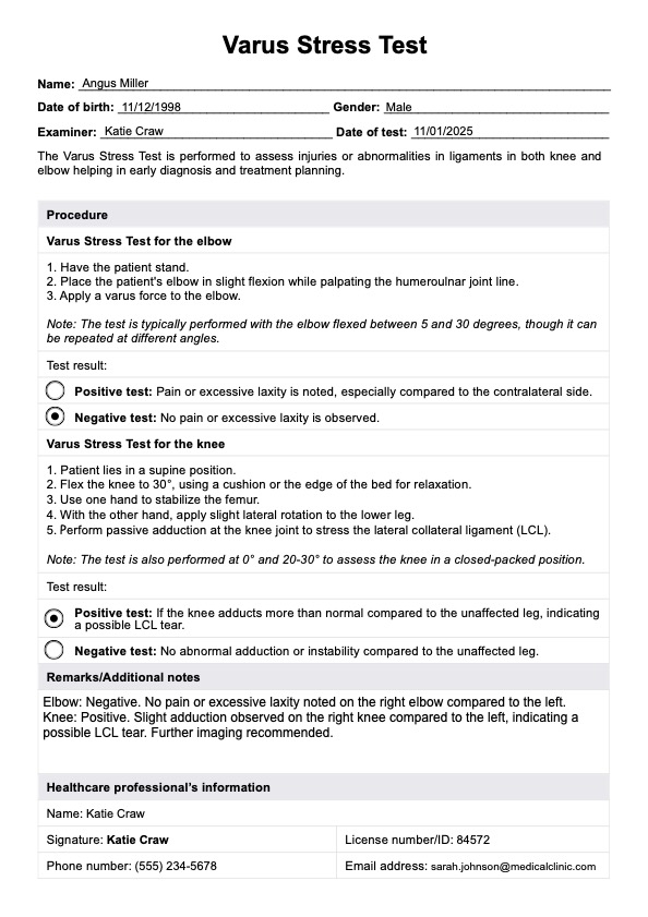 Conduct and record test results for a Varus Stress Test with our comprehensive step-by-step PDF guide and template. Access this for free!