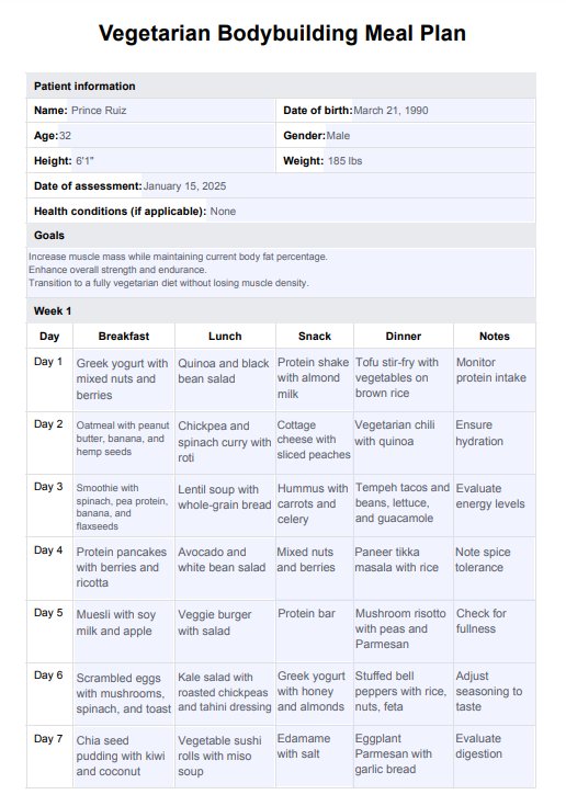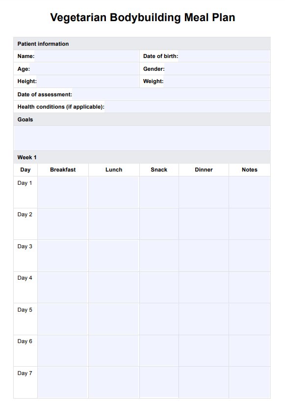 Download Carepatron's free Vegetarian Bodybuilding Meal Plan PDF and help support patients with plant-based fitness and muscle growth.