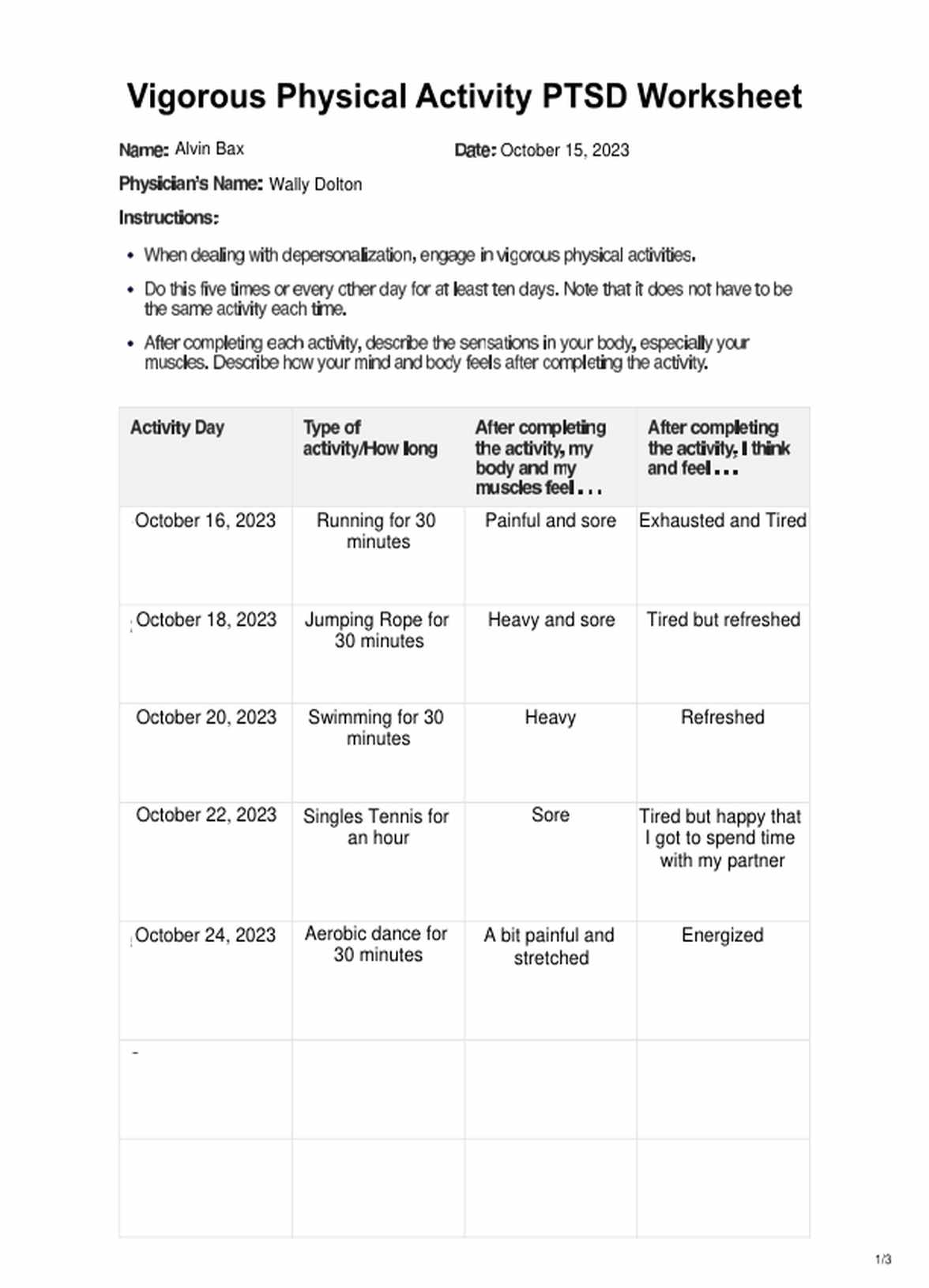 Accomplishing the Vigorous Physical Activity PTSD Worksheet can take at least 15 minutes after every exercise and longer if the client isn’t used to reflecting on their thoughts, feelings, etc. To accomplish the whole worksheet, it will take at least ten days to complete.