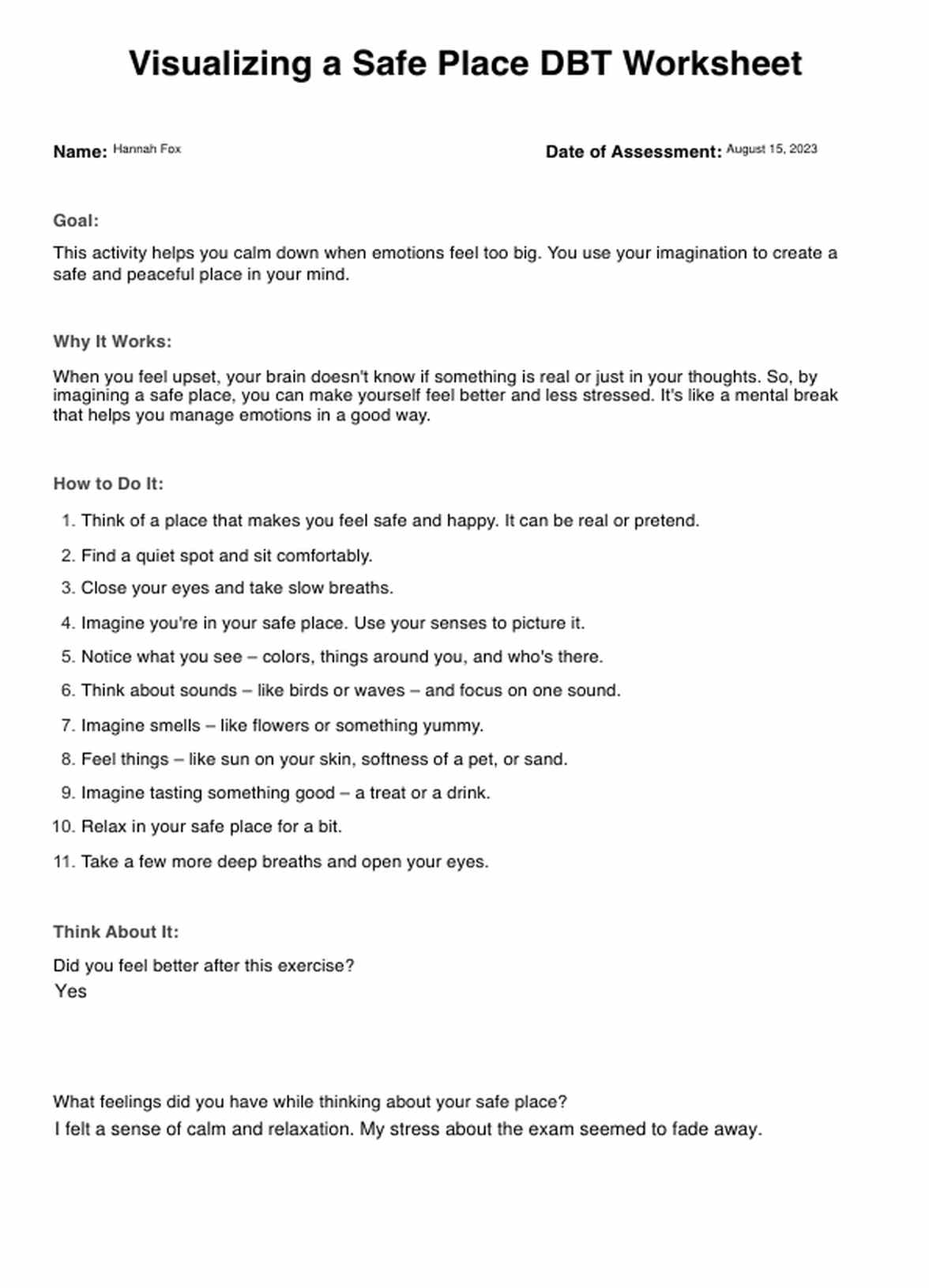 Get access to a free Visualizing a Safe Place DBT Worksheet with Carepatron. Use the PDF template for your practice today!