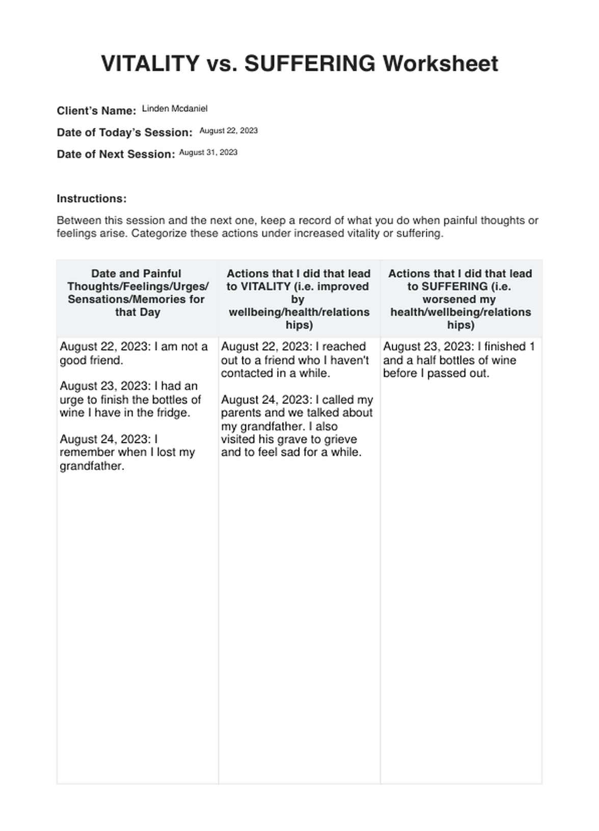 Practitioners who have training in ACT, like therapists, psychologists, counselors, and psychologists, can use and provide a copy of the Vitality vs. Suffering Worksheet to clients they feel need assistance dealing with painful and disturbing emotions, thoughts, etc.