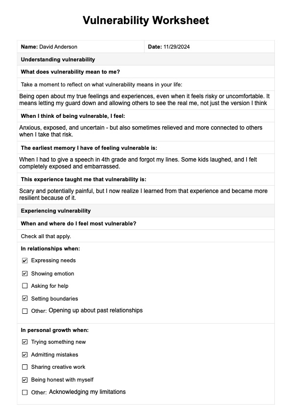 A Vulnerability Worksheet can benefit individuals seeking personal growth, improved emotional intelligence, or better relationships. It is particularly useful for those struggling to express emotions or fear intimacy. Mental health professionals may also use it as a therapeutic tool to help clients explore and embrace their vulnerabilities in a safe environment.