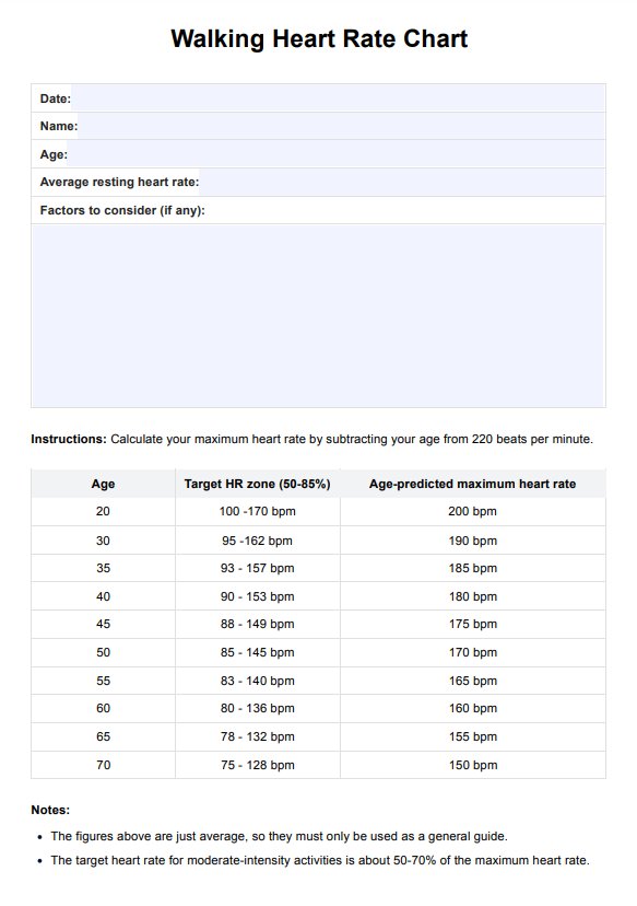 Use a reference tool to help track patients' heart rates during physical activities with our Walking Heart Rate Chart PDF.