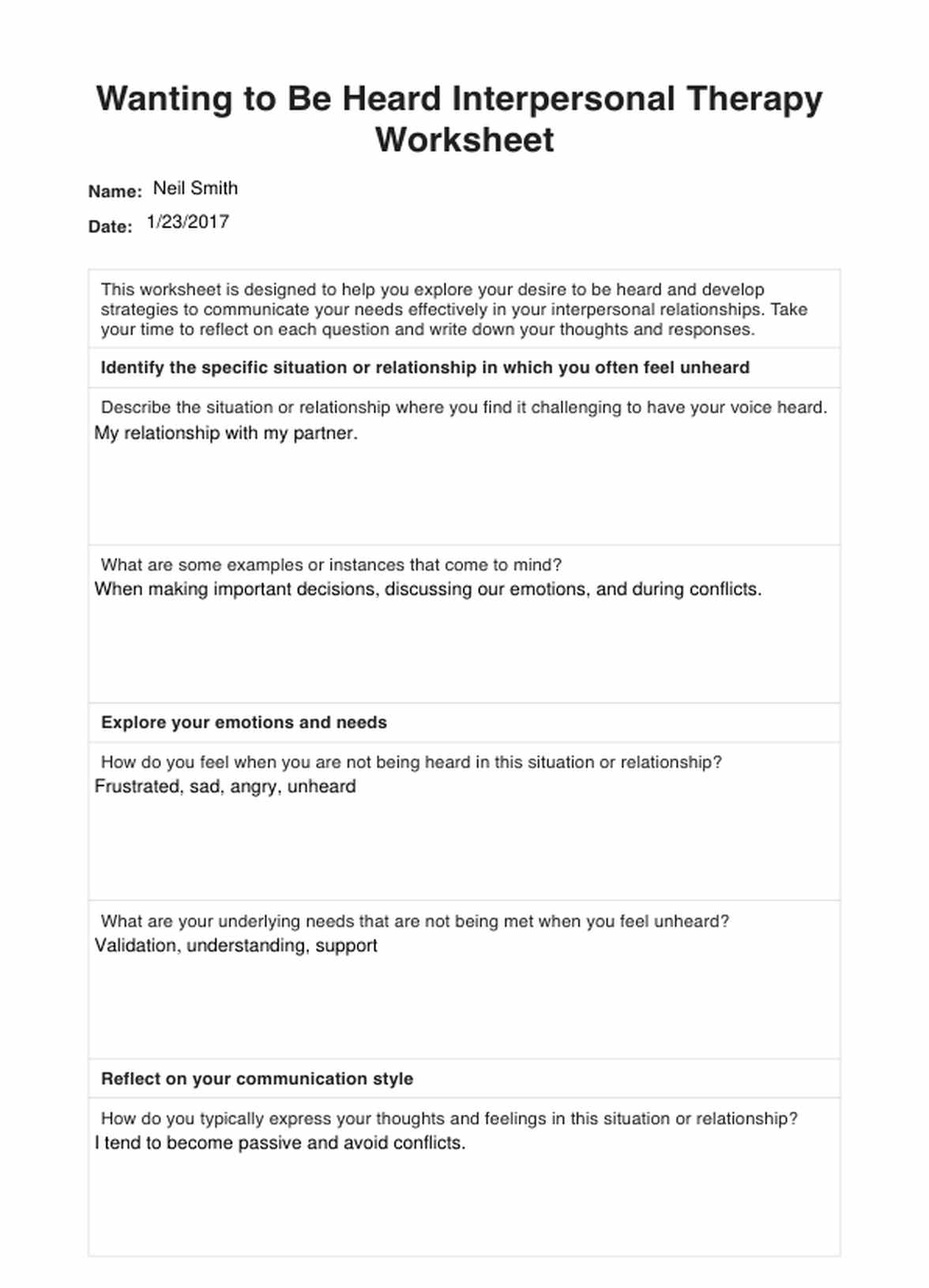 Get a free Wanting to be Heard Interpersonal Therapy Worksheet for your practice. Download our template and PDF example today!