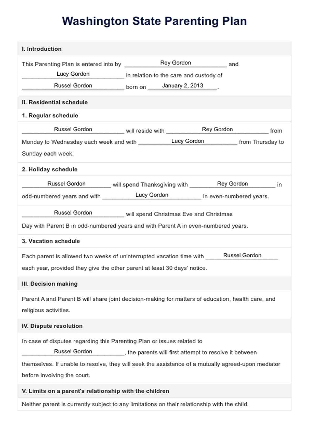 Washington State Parenting Plans Template