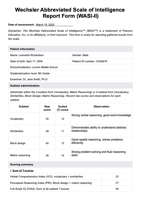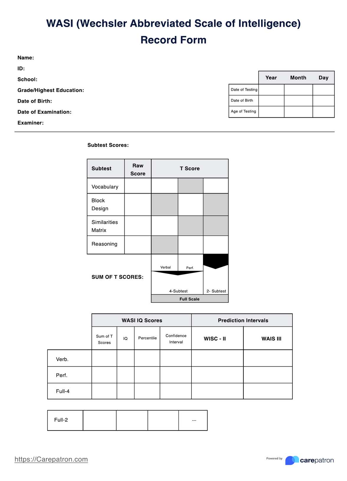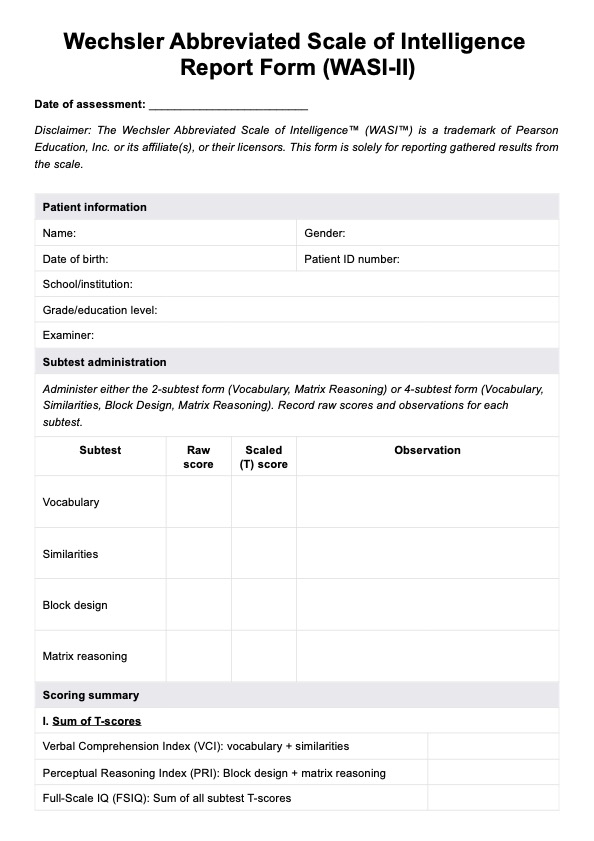 Integrate Carepatron's free Wechsler Abbreviated Scale of Intelligence (WASI) PDF template and effectively streamline cognitive assessments.