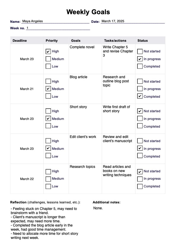 The Weekly Goals Template is ideal for setting and tracking goals at the beginning of each week or for planning projects.