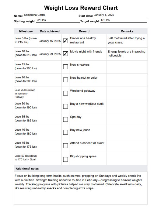 Teach clients how to leverage non-food-related rewards to encourage weight loss, with our Weight Loss Reward Chart Template. Try it now!