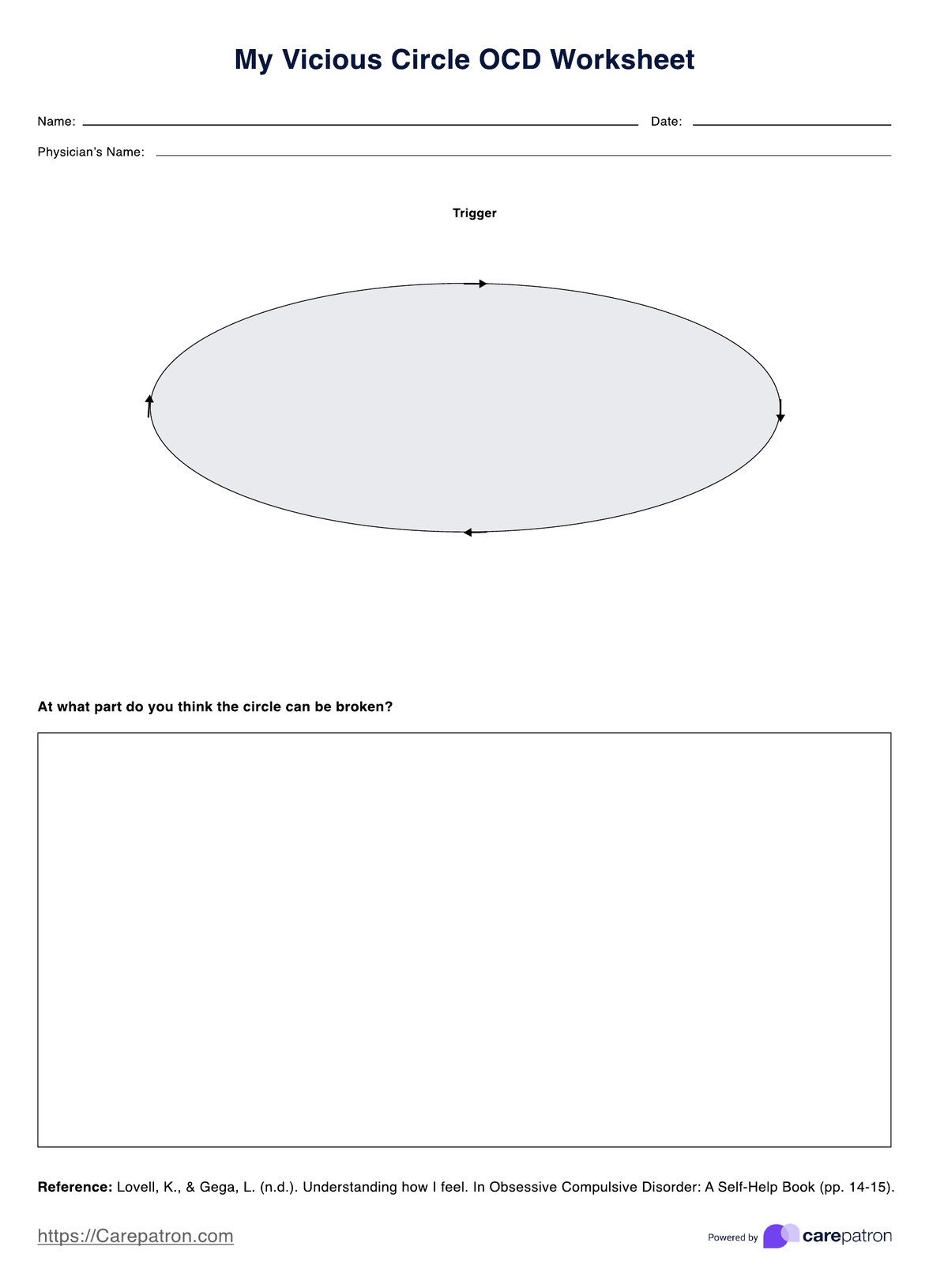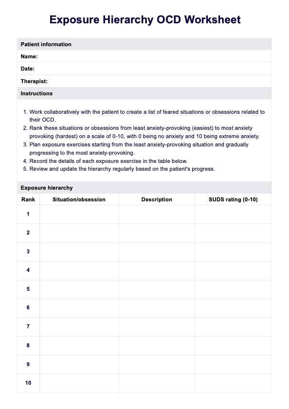 The time it takes to complete this worksheet varies significantly from person to person and session to session. Several factors can influence the amount of time spent on this worksheet, including the complexity of the client's OCD symptoms, the depth of exploration required, and the client's willingness and ability to engage in self-reflection and discussion. It may take one to two sessions for clients to complete this worksheet.