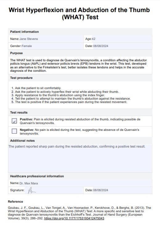 Diagnose De Quervain's Tenosynovitis with our WHAT Test template. Simplify assessments, document results, and enhance patient care effectively and efficiently.
