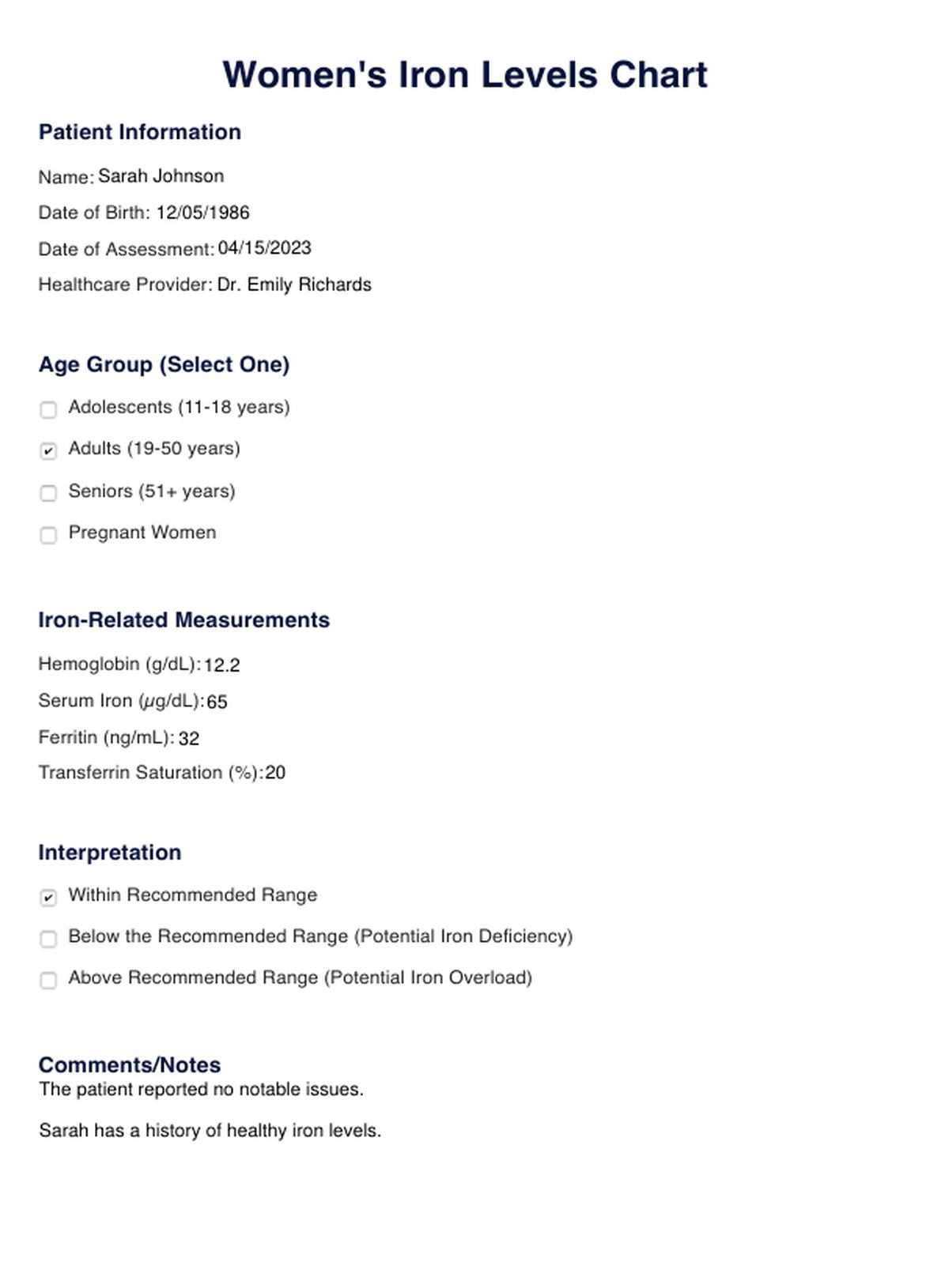 Track and manage iron levels with our Women's Iron Levels Chart. Easily assess and monitor, promoting optimal female health.